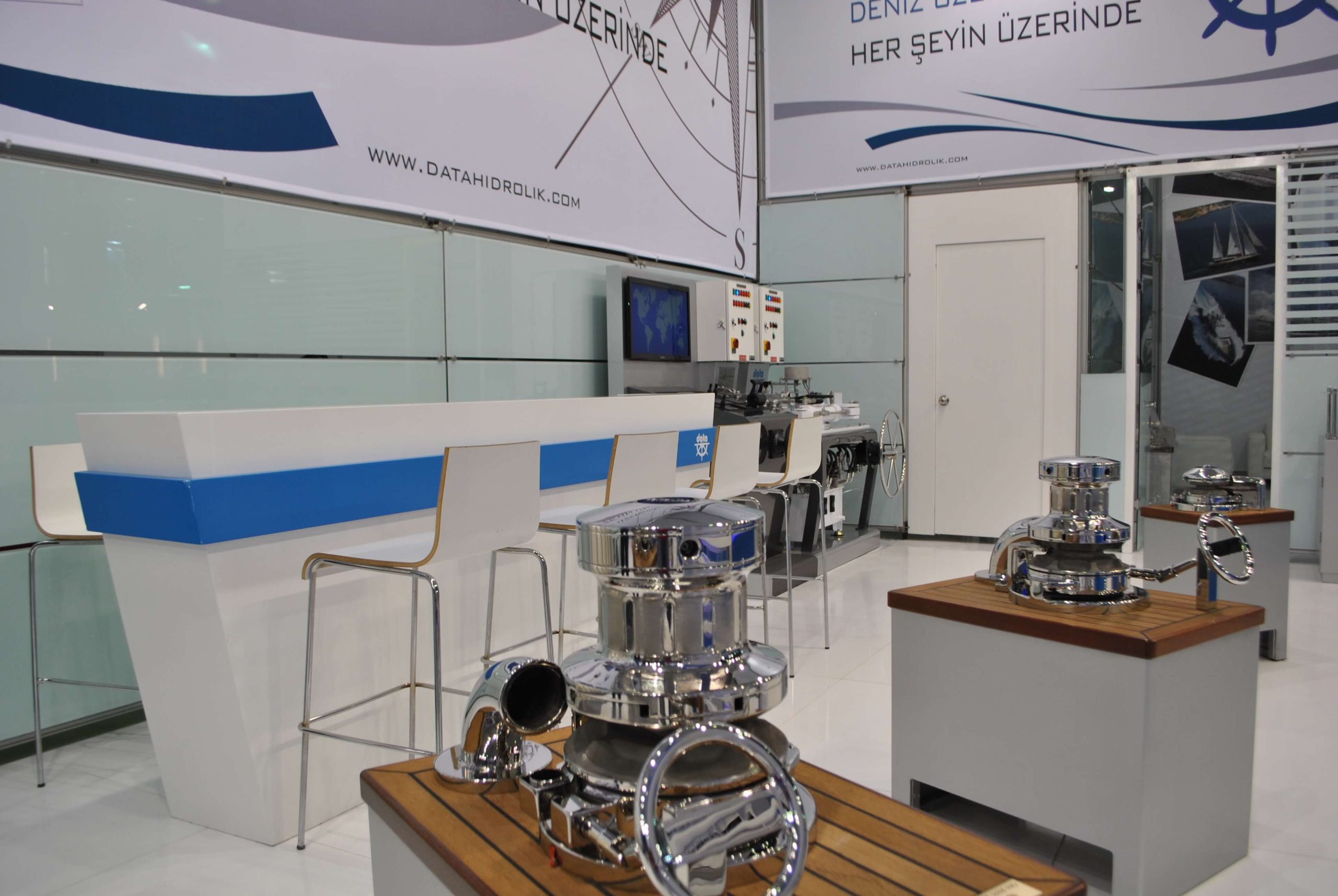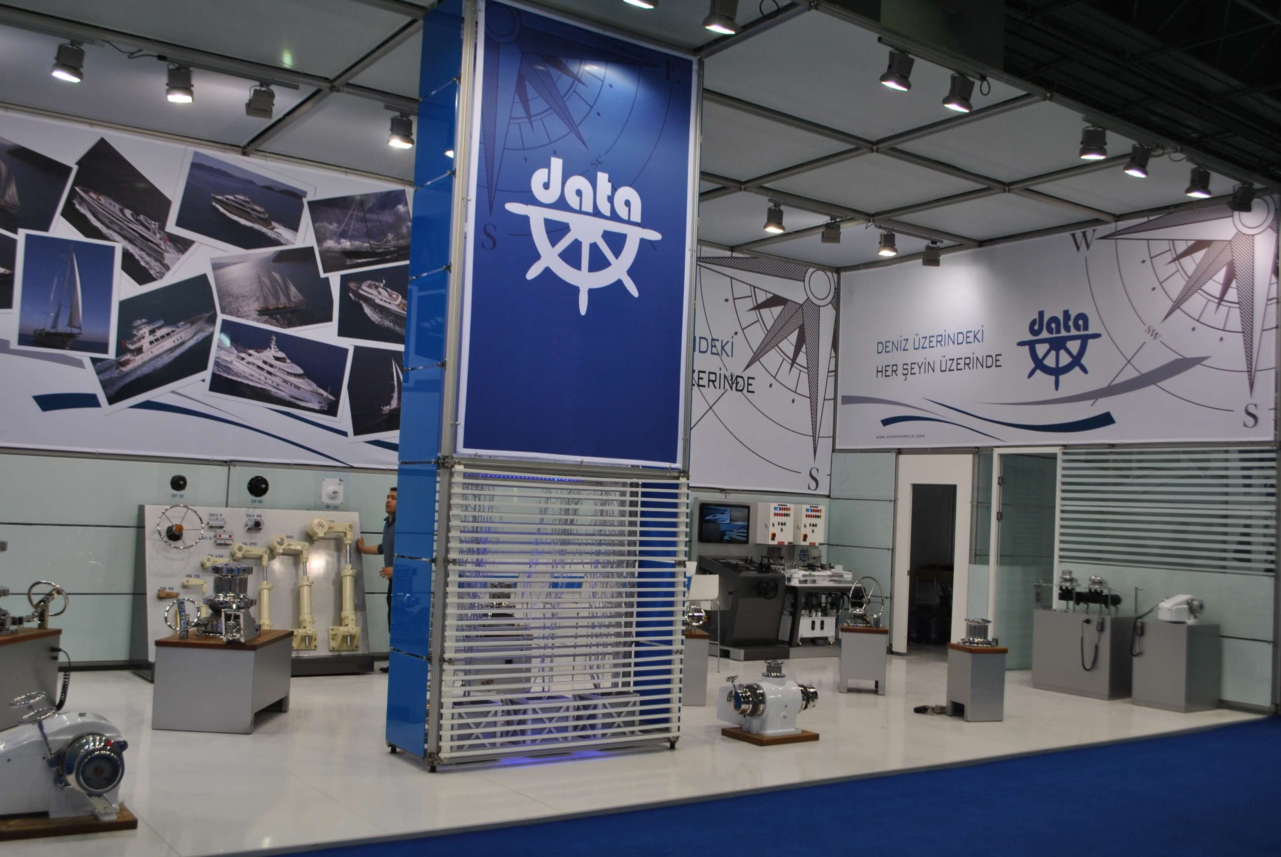 Bu fuar standı, denizcilik temalı Data markası için özel olarak tasarlanmıştır. Standın ana strüktürü, modüler metal profillerden oluşan, sağlam bir iskelet sistemidir. Beyaz ve denizci mavisinin hakim olduğu renk paleti, markanın faaliyet alanını yansıtmaktadır.