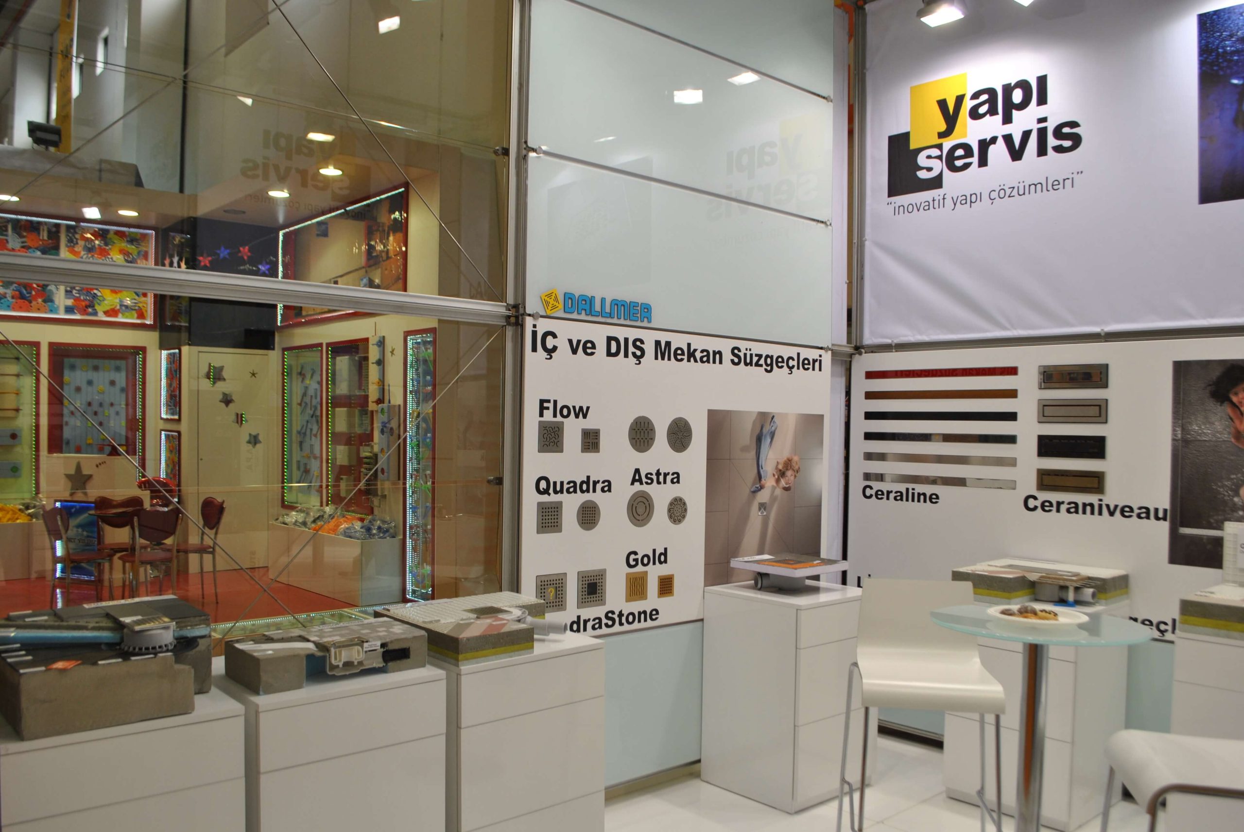 Ana strüktür, alüminyum profillerle oluşturulmuş olup, şeffaf ve opak panellerin birleşimiyle dinamik bir dış cephe oluşturur. "Yapı Servis" markasına ait logo ve "inovatif yapı çözümleri" sloganı, standın ana panolarında net bir şekilde sergilenmektedir.